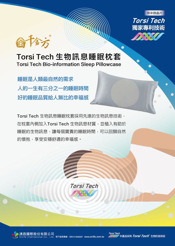 Torsi Tech生物訊息睡眠枕套採用先進的生物訊息技術,在枕套內側加入Torsi Tech生物訊息材質,並植入有助於睡眠的生物訊息,讓每個寶貴的睡眠時間,如同回歸自然的懷抱,享受安穩舒適的睡眠。